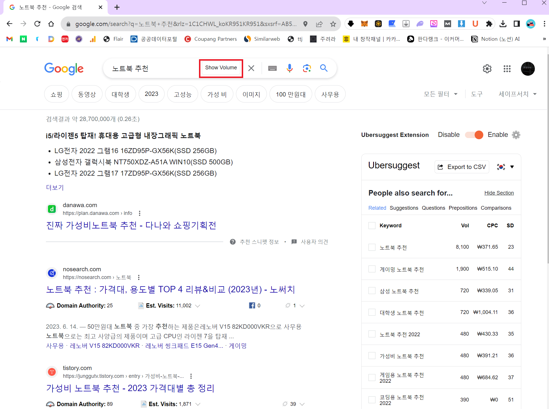 이로써 모든 설치 과정은 끝났다. 예시로 구글 검색 창에 '노트북 추천'이라고 쳐 보자.